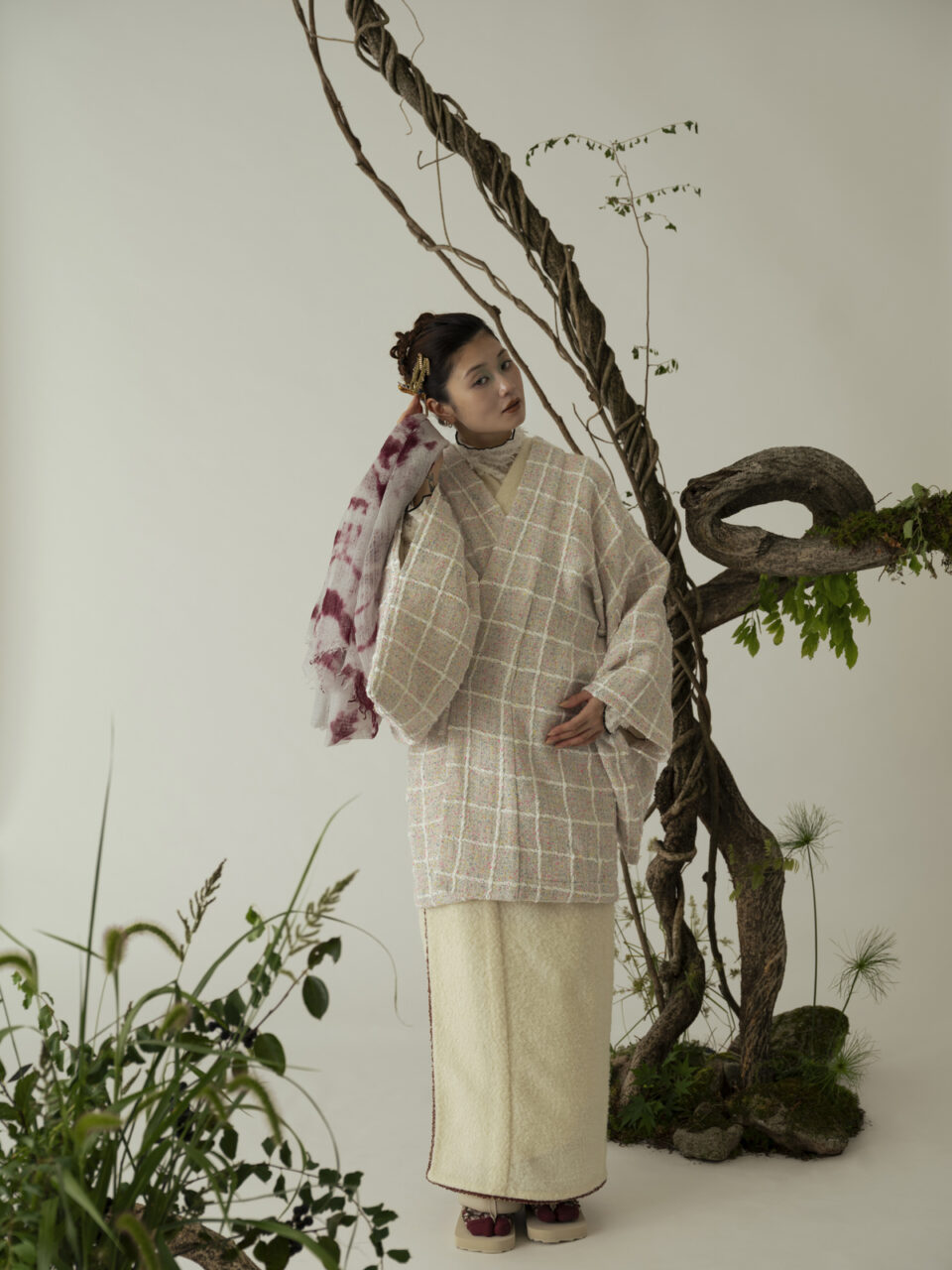現在では、手しごとの風合いを大切にしたツイードの一種として発展し、日本でも岩手や山形など、羊の飼育が盛んな土地に根づいた産業として受け継がれています。ARCHが大切にする“その土地ならではの手しごと”の魅力に光を当て、世界を見渡す視点を一枚のきものに宿しています。