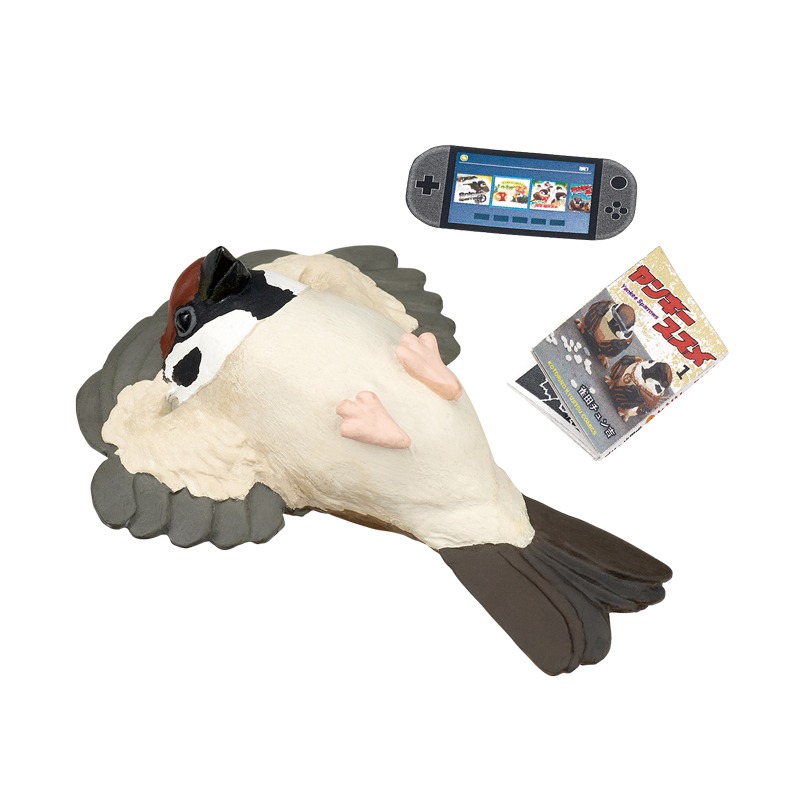 「ヤンキースズメ」、「くつろぎインコ」等…小鳥たちのコミカルな姿をリアルな造形で表現した「ことりの休日」シリーズの新作として登場の本アイテムでは、“ただただ家でぐうたらする”スズメたちをフィギュア化。