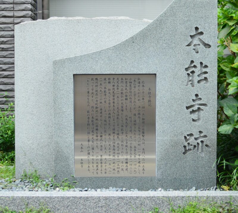 一方、実際に激戦の舞台となったのが旧本能寺跡と二条新御所跡ですが、いずれも「跡」であるため、現在は石碑が残るのみです。旧本能寺跡は四条西洞院に位置し、廃校となった本能小学校の旧敷地角に石碑が建てられています。