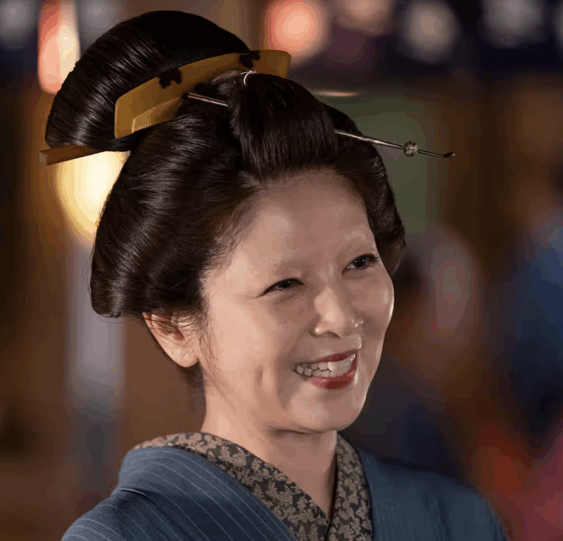 駿河屋の女将ふじ(飯島直子)は、蔦重の母親です。マイペースで、蔦重が夫に“階段落ち“させられても、気にしないでお菓子を食べつつ帳簿付けなどをしていたキャラでした。