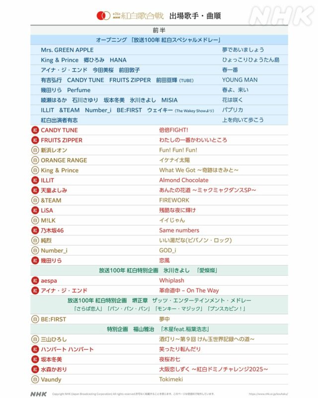 12月31日(水)にNHKで放送される大晦日恒例番組「第76回NHK紅白歌合戦」の、出場歌手・曲順リストが公開されました。