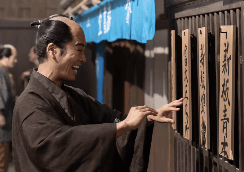 「身上半減」の刑で、見事にのれんや看板などすべてを半分にされがっくり来ていたものの、訪れた太田南畝(桐谷健太)に「世にも珍しい店だ!」と言われ、町の人が大笑いしているのをみて「身上半減の店」の看板を出して本を売り込むのは、はさすが、転んでもただでは起きない蔦重でした。