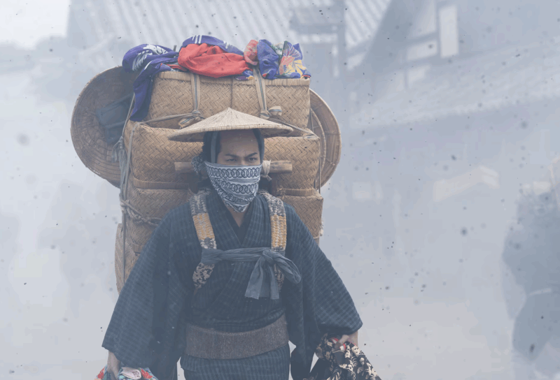 日本橋の町が、浅間山の噴火の灰で埋もれてしまったとき、いち早くかけつけた蔦重。屋根に登って灰が店の内部に入り込まないよう、吉原で集めてきた女郎たちの着物を詰めて大活躍。