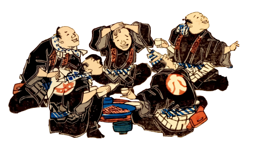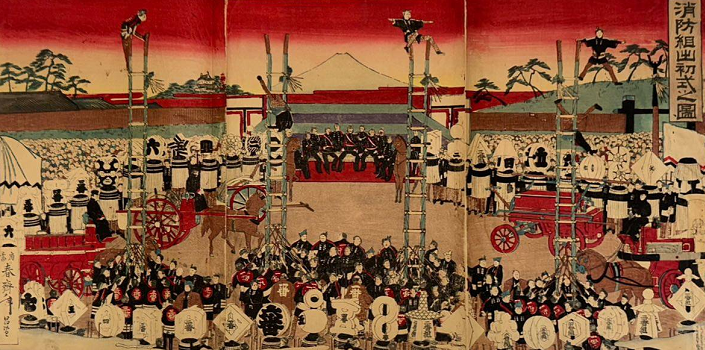 三谷祥介『帝都消防出初式の今昔』によると、各区の消防組がはしご乗りを披露して技量を競い合い、終了後は大警視(警視総監)から酒肴が振る舞われて宴会という流れでした。