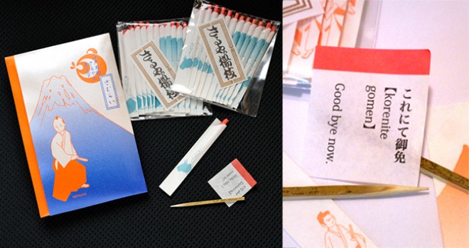 この「さむらい楊枝」には黒文字製の楊枝に、「さむらいの一言」が書かれた小さな紙を一本一本巻きつけたもの。なんと英訳まで付いていて、例えば「いざ参ろう」はLet’s go、「たのもう」はHello,May I come in?、と、思わずくすっと笑ってしまいそう。海外へのお土産などにも喜ばれそうです。
