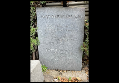 キアラ神父の墓碑は一九四三年、キリシタン研究家であるタシナリ神父が雑司ヶ谷霊園で発見し、許可を得て調布へ移されたものです。
