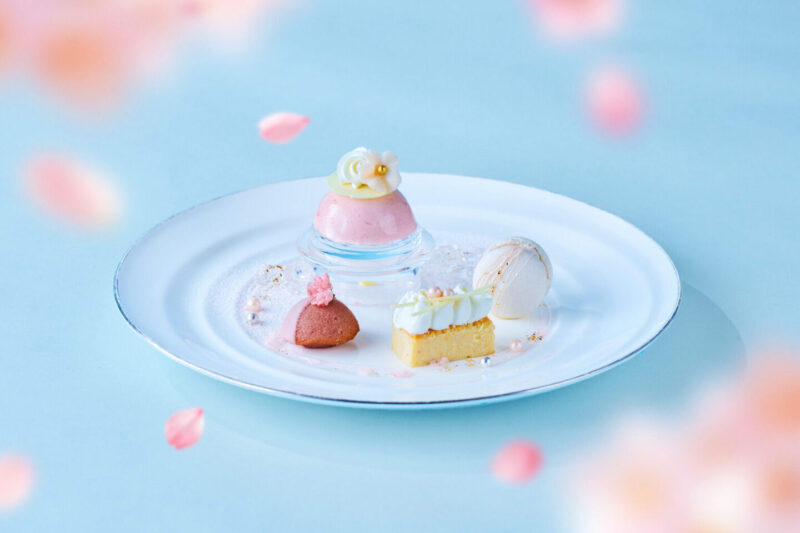 桜のジュレ×マスカルポーネのグラススイーツや、桜香る苺ムース、ライチ×ピンクグレープフルーツのパートドフリュイなど、“透明感ときらめき”をイメージしたラインアップ。
