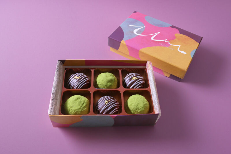 新商品の『むにゅっとしょこら』は、従来の生八ッ橋で餡を包むカタチから、発想の転換をし、チョコレートをたっぷり練り込んだチョコ餡でもちもちした生八ッ橋の生地を一つ一つ優しく包み込んだ新食感生八ッ橋スイーツです。
