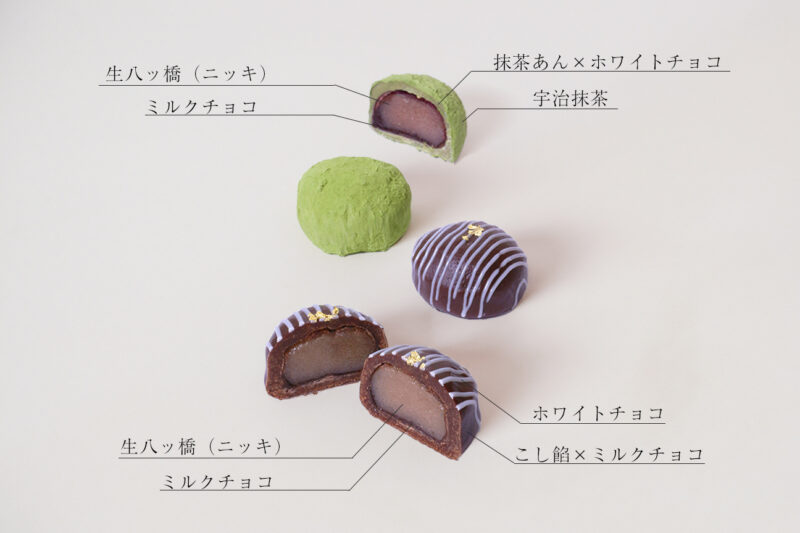 味わいは、抹茶あん × ホワイトチョコを宇治抹茶で覆ったものと、こし餡×ミルクチョコにホワイトチョコをかけたものの2種。