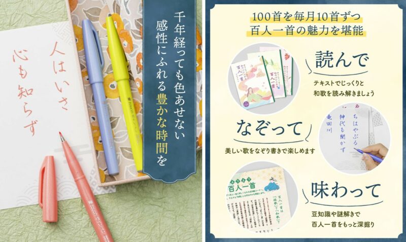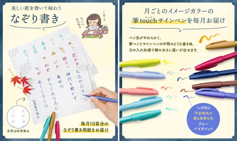 各回ごとのテーマに合わせて選んだ色の筆touchサインペンと10首分のなぞり書き用紙をお届け。集中してゆっくりと文字をなぞることで心も落ち着き、歌を一層味わうことができます。