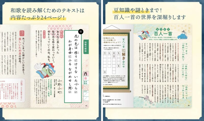 天野慶さんのわかりやすい解説で、一首ずつじっくり味わえるテキストです。歌を読み解くヒントとなる基礎知識から、誰かに話したくなる豆知識、学んだ内容で楽しめる謎解きまで、百人一首の世界を味わい尽くせるテキストです。内容たっぷりの24ページで、読みごたえも充分。