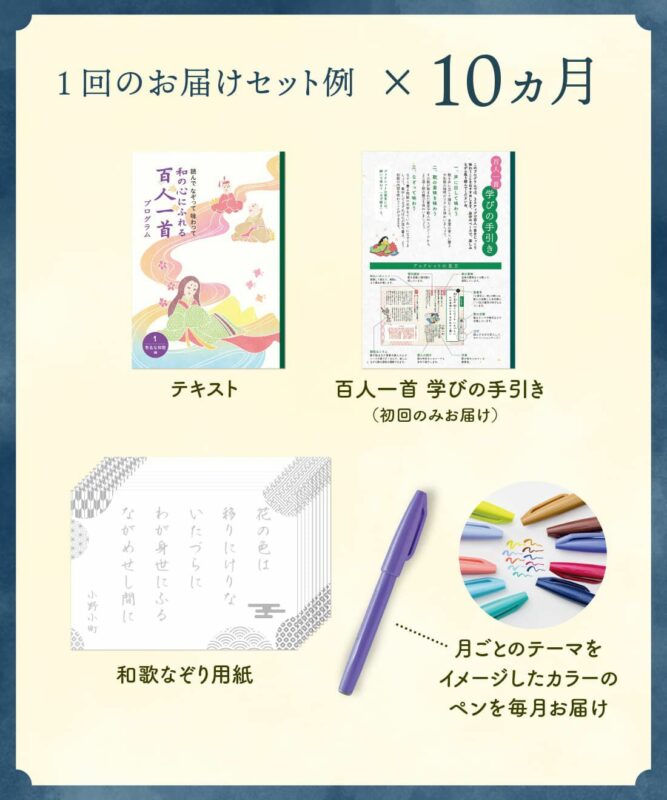 テキスト、和歌なぞり用紙、月ごとのテーマをイメージしたカラーペンが毎月届きます。そのほか、プログラムの楽しみ方や歌がテーマごとにリストになった「百人一首学びの手引き」を初回のみ届きます。