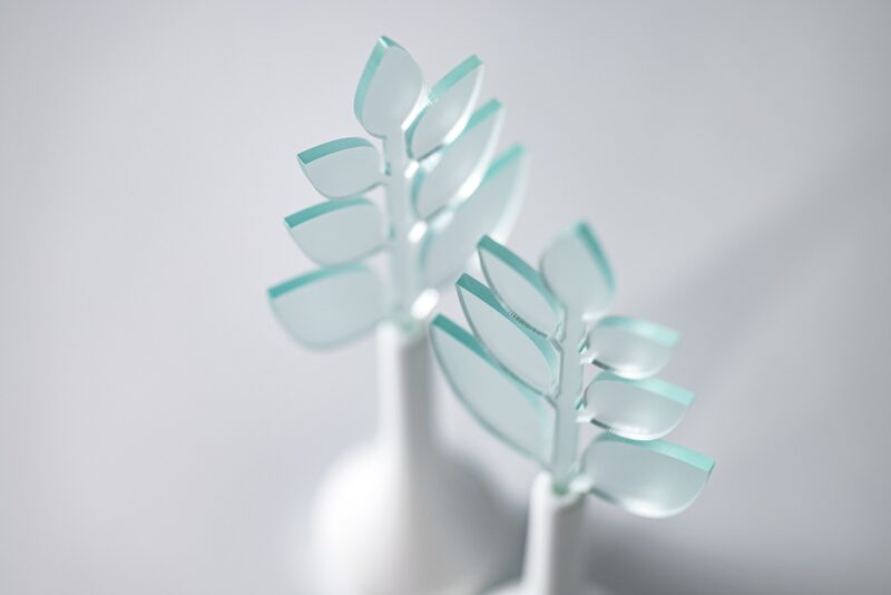 本シリーズの中でも人気の高い、磨りガラスのような質感のアクリルを用いた「光」シリーズに新登場した、「翡翠グリーン」。正面から見ると薄いグリーン。断面は色が濃く見え、レトロなガラスの様な質感です。