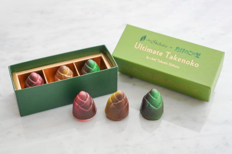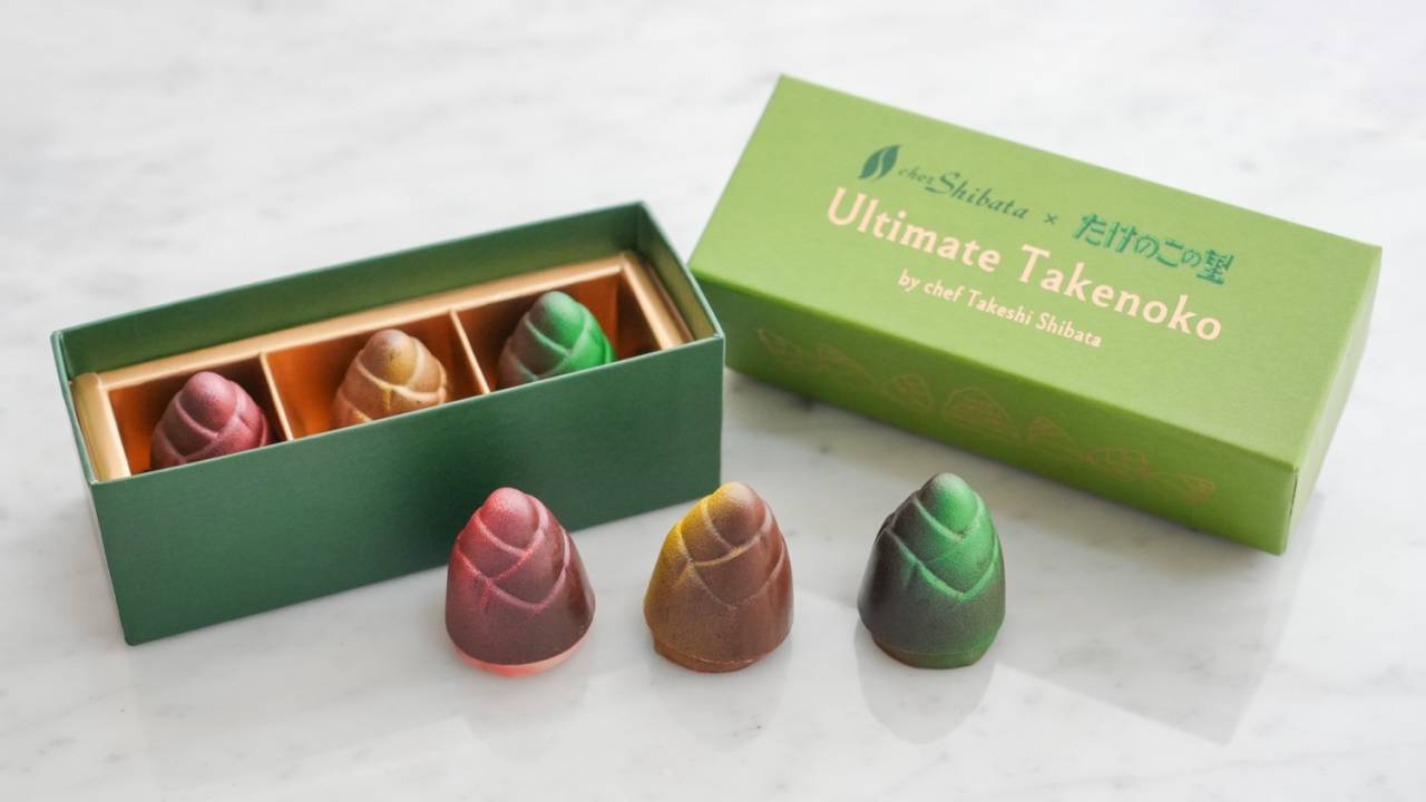 「シェ・シバタ」が2026年ヴァレンタインで発表した「アルティメットタケノコ」は、明治のロングセラー「たけのこの里」を、「究極(アルティメット)」をテーマに再構築。厳選された産地別カカオ豆を使用し、スパイスやお酒、岩塩を組み合わせた、大人向けの贅沢なボンボンショコラです。