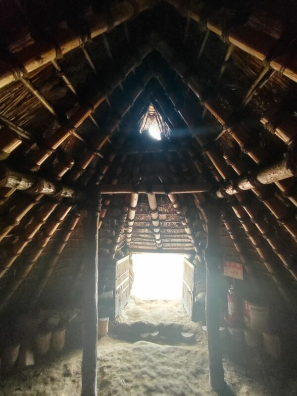 竪穴住居には炉が設けられ、多くの時間は火を炊ていたと考えられています。屋根の頂部には排煙や換気のための「換気口」があり、炉の煙は大きな屋根の隅々まで行き渡る構造になっていました。