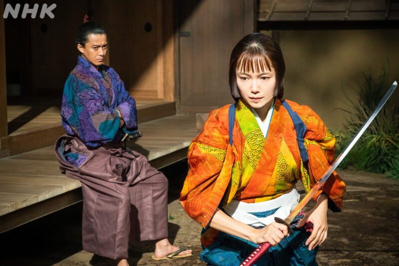 剣の稽古を終えたお市が、「わかりました。浅井家に嫁ぎます」と伝えると、伏目がちに「すまぬ」という信長。