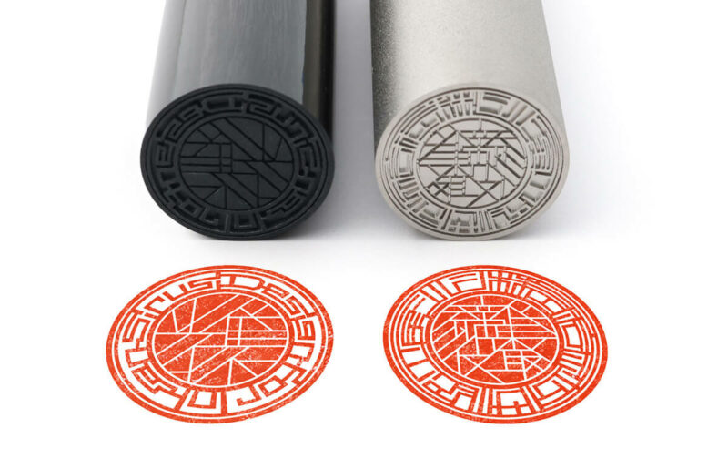 そんなマンホールのデザインに着想を得て開発された法人用デザイン印鑑「マンホール印グラフィー」は、外周には屋号の文字を連続して配置し、文字そのものをレリーフ模様のように構成。中央には肩書きを直線的な白文字で配置し、幾何学的でモダンな印象の印影デザインに仕上げています。