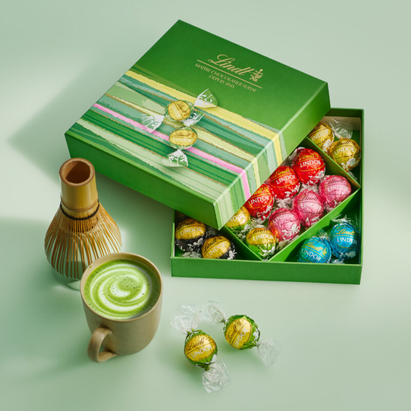 季節限定の「リンドール 抹茶」を中心に、「ミルク」「ダーク」「ホワイト」などリンツの王道フレーバーを詰め合わせたアソートボックス。抹茶の上品なほろ苦さと、定番フレーバーのコクや甘みを一度に楽しめます。