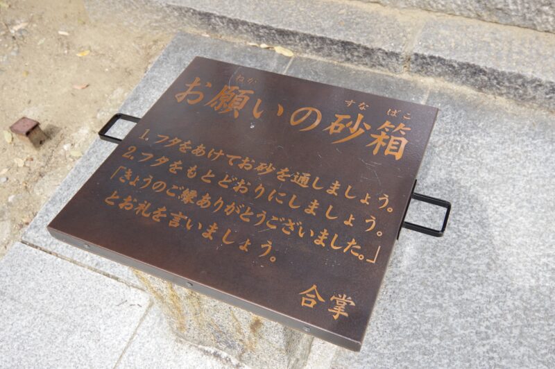 五輪塔は高さ2メートル。地輪の表面には秀長の戒名が刻まれているので注目しましょう。また、墓所前には「お願いの砂箱」があり、名前と願い事を唱えて3回砂を通すと願い事が叶うという伝承があります。