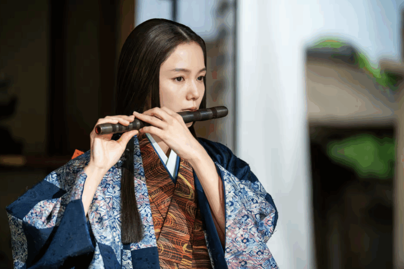 笛の音が突然風を引き起こし、お市が側に置いたたくさんの秀吉からの手紙が飛ばされて、空中に舞い上がります。