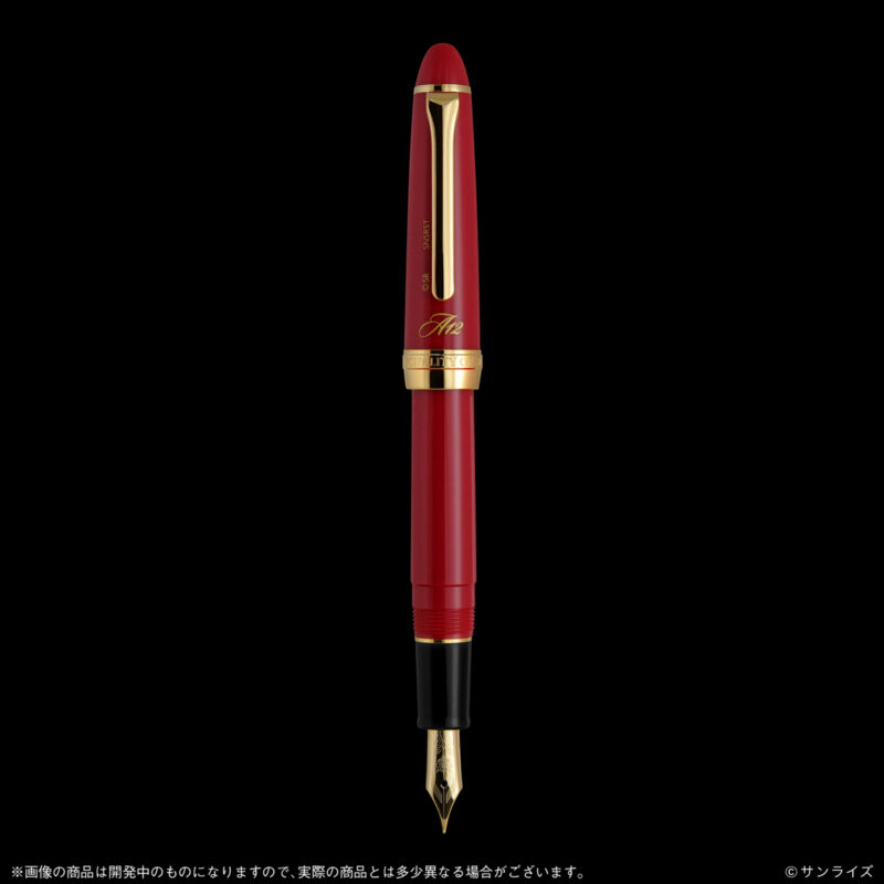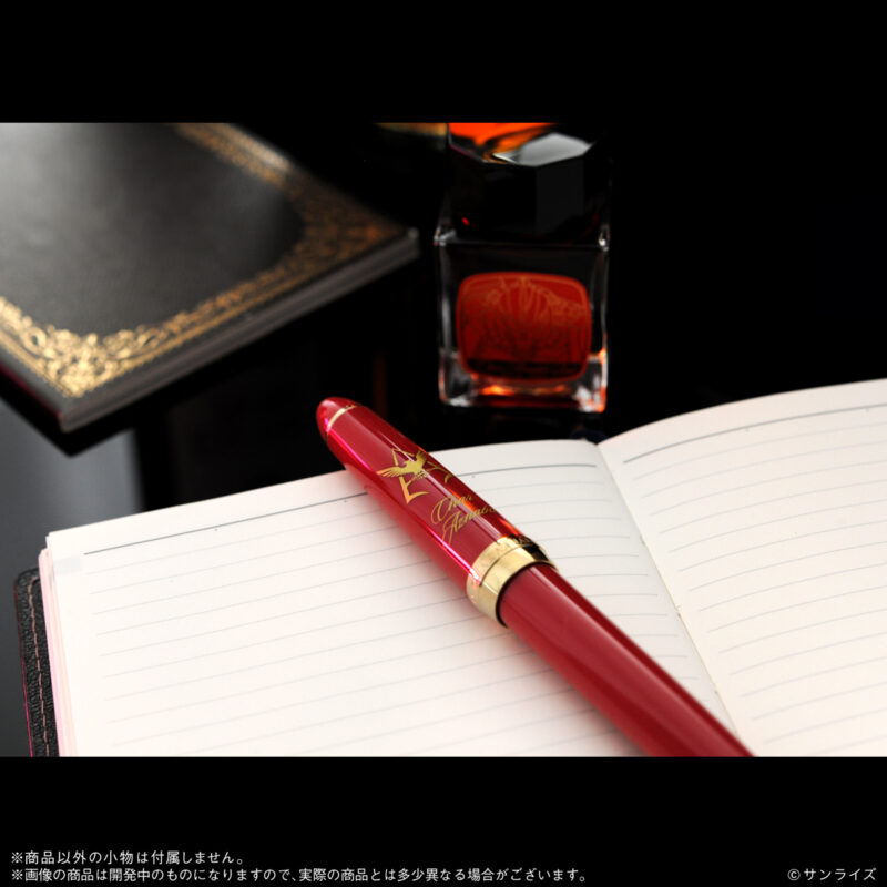 セーラー万年筆社製の万年筆で、万年筆の上蓋部分には、エンブレムと所属部隊番号をゴールドでデザイン。キャップリングには「CHAR AZNABLE」の刻印が施されており、高級感と存在感が際立っています。