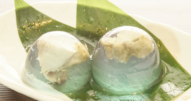 一目見た時には涼し気な水菓子。ひんやりつるんで、夏にピッタリ!なんですが、よく見てみるとぷるぷるの中に浮かんでいるのはやきとり。これ、スイーツじゃなくて食べたらやきとりの「水菓子やきとり」なんです。