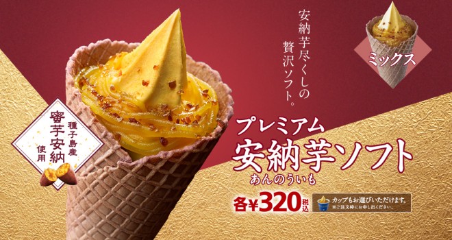 プレミアム安納芋ソフトは価格320円。同時にプレミアム安納芋ミックスソフトも発売されます。