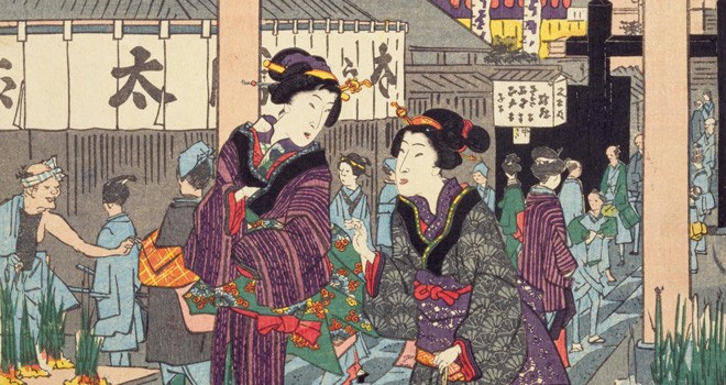 しょうがにまつわるこんな川柳もあります。「甘口の 言葉はゆかず 葉しょうがの 辛き目をする 市の人ごみ」(葛飾北斎「東都名所一覧」より)。しょうが市でのあまりの人混みでひどい目にあった、という内容がおもしろく詠まれています。