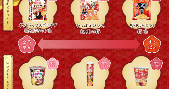 カルビーは毎年1月〜2月にかけて梅味の新商品を発売していますが、今年は過去最多の6ブランドからの発売。発表された新商品を見ていきましょう!
