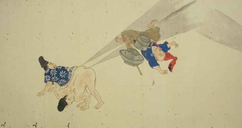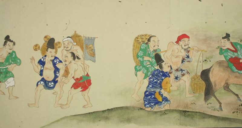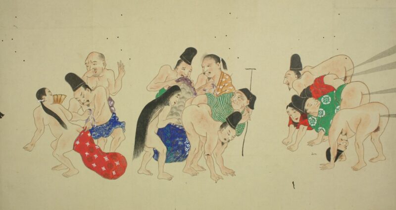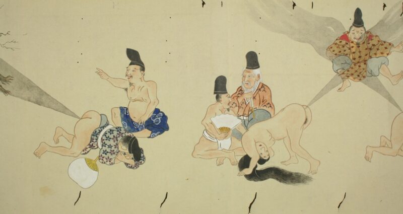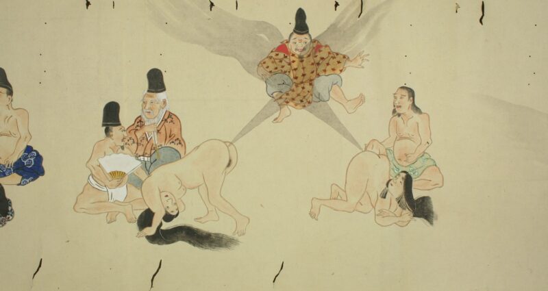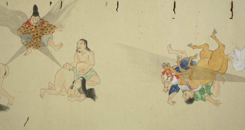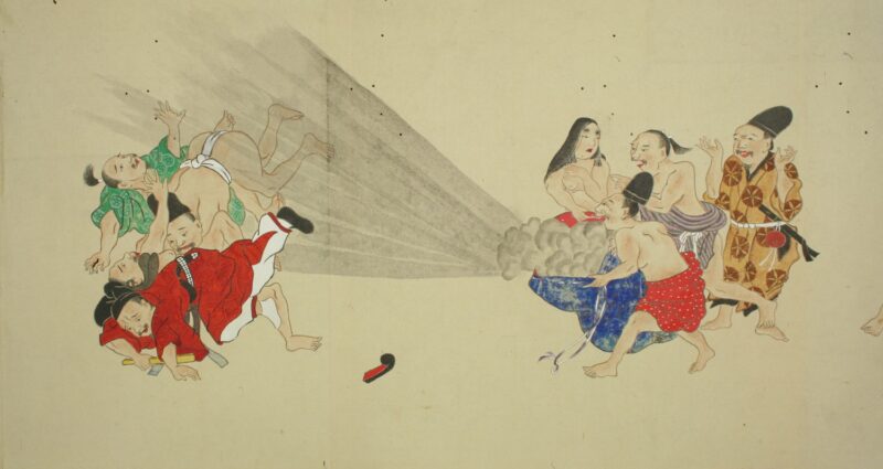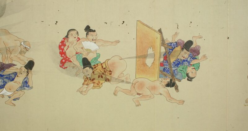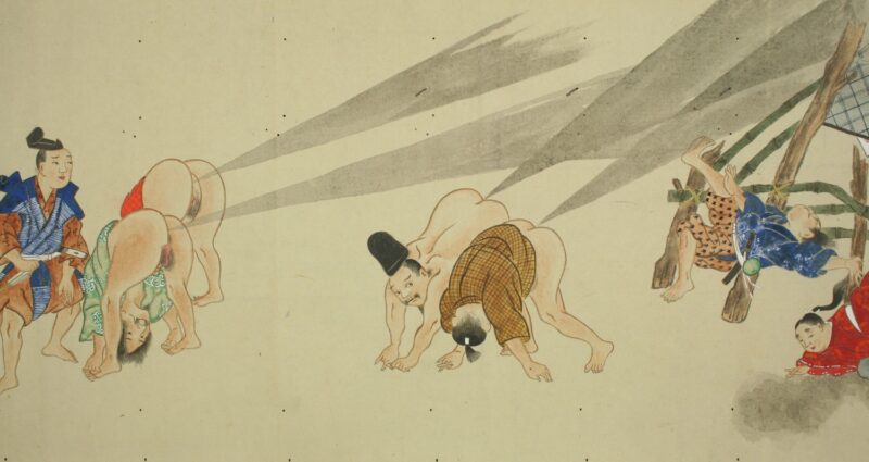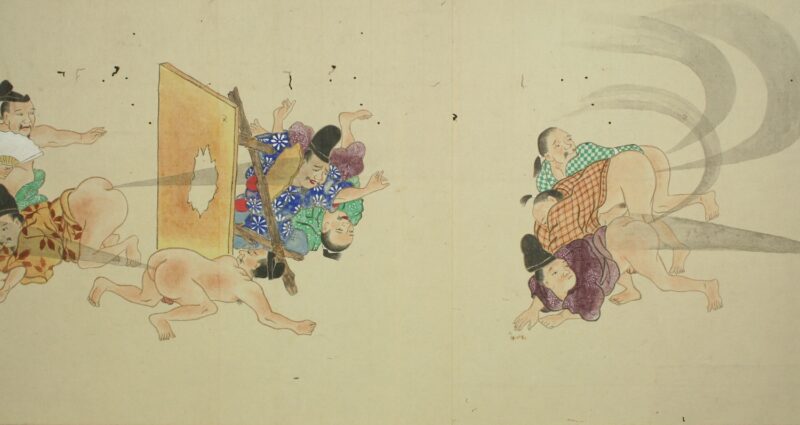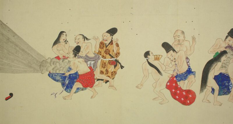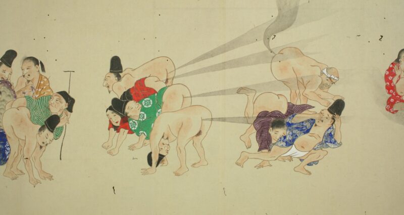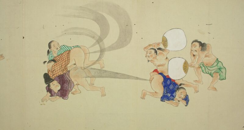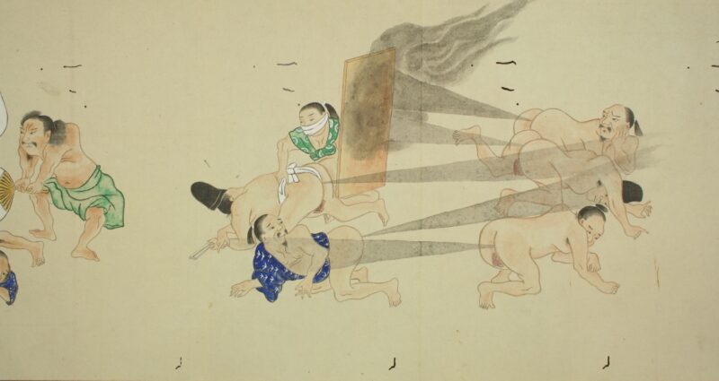江戸時代に描かれた絵巻物「放屁合戦絵巻」。「放屁合戦絵巻」は、敵対する(?)2組のグループが、オナラを武器にして合戦を広げるというもの。