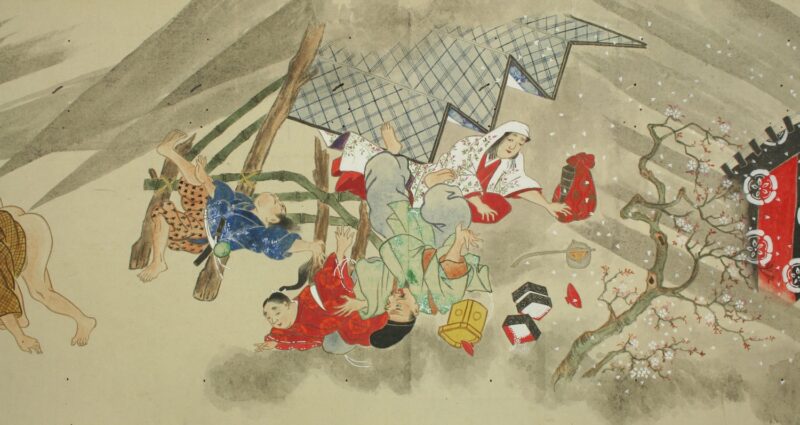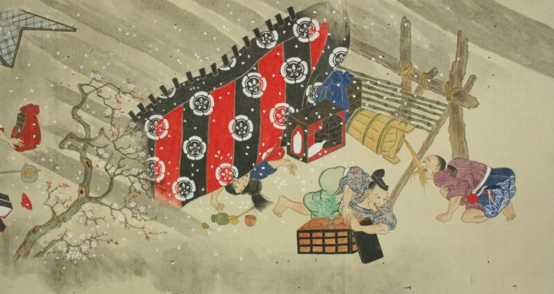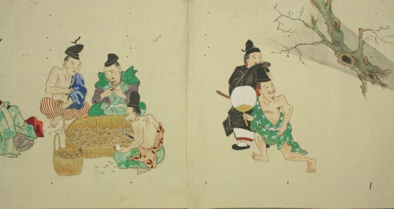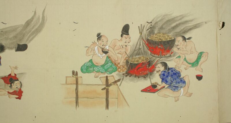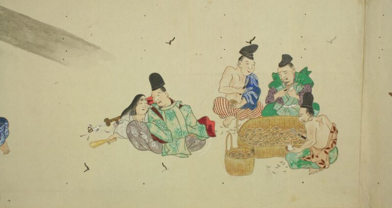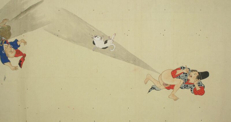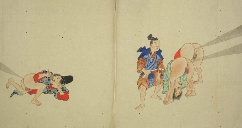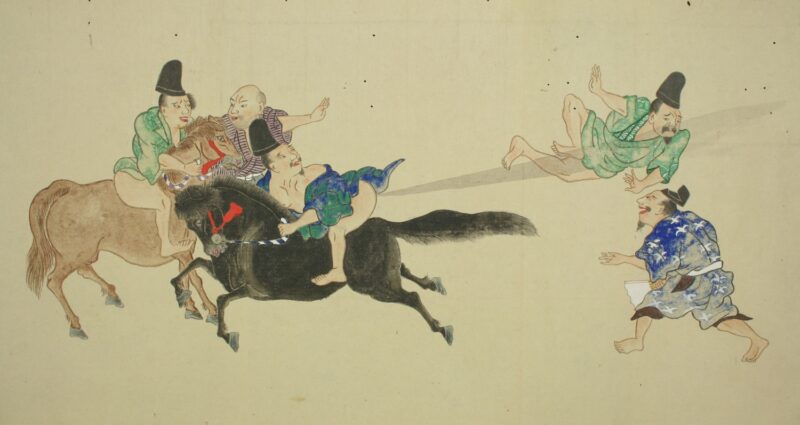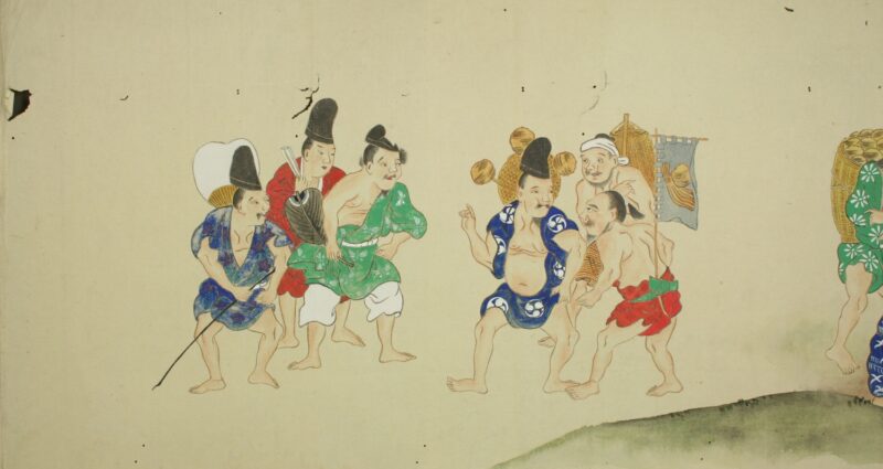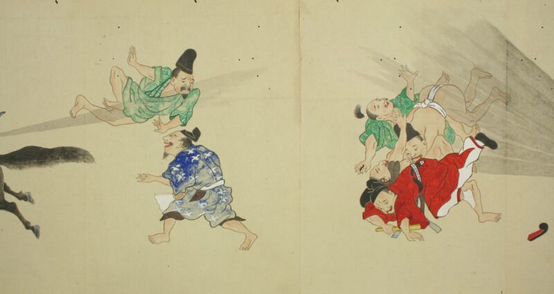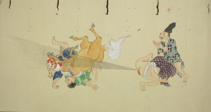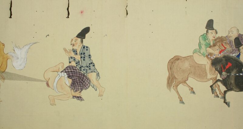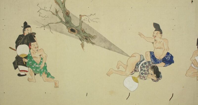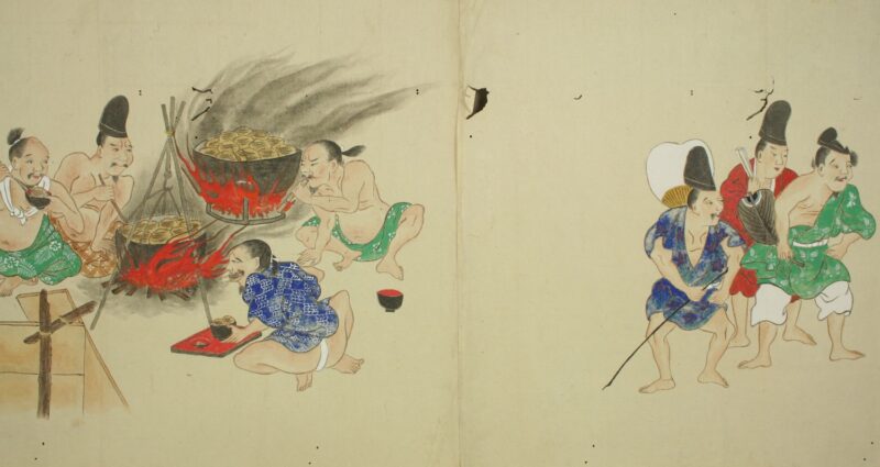 江戸時代に描かれた絵巻物「放屁合戦絵巻」。「放屁合戦絵巻」は、敵対する(?)2組のグループが、オナラを武器にして合戦を広げるというもの。